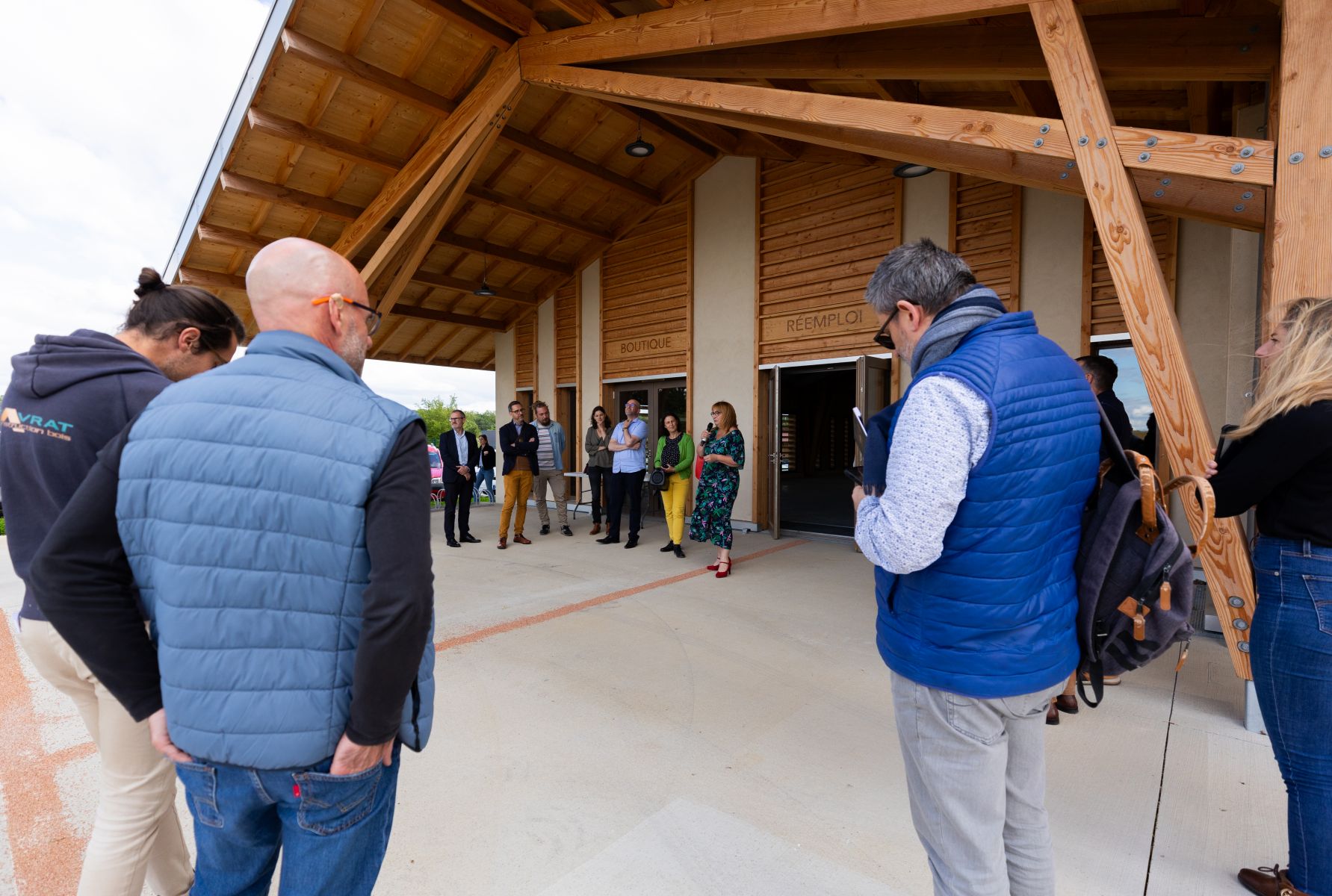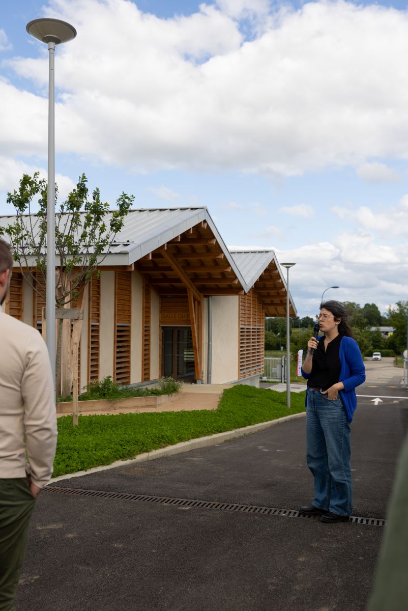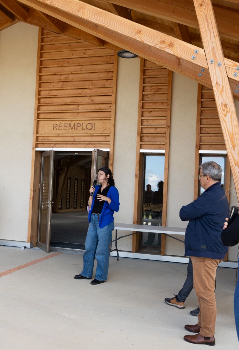 Commentée par la CC DOMBES, le maître d’œuvre Sandra RÜDIGER /Tekhnê-Lieux FAUVES et en présence d'entreprises ayant participé à sa construction, la visite du site s’est poursuivie par une table-ronde où Isabelle DUBOIS, Présidente de la CC Dombes a expliqué comment ce projet a émergé, Christophe MONIER, Vice-Président environnement CC DOMBES a présenté le fonctionnement prévu pour cette recyclerie et ses particularités.