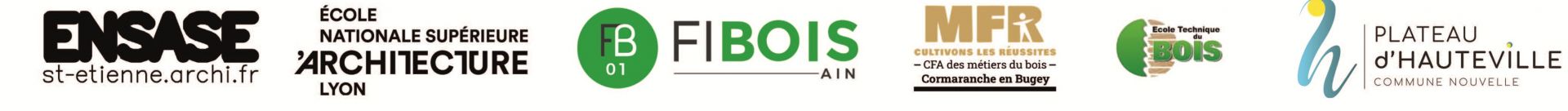 Mercredi 22 octobre, les participants, partenaires et acteurs du workshop inter-école étaient réunis pour un temps fort qui vient clore l’édition 2025 : l’inauguration des bancs semi-circulaires en bois local, réalisés par des équipes d’étudiants charpentiers de la MFR de Cormaranche-en-Bugey et étudiants architectes ENSA Lyon et St-Etienne.