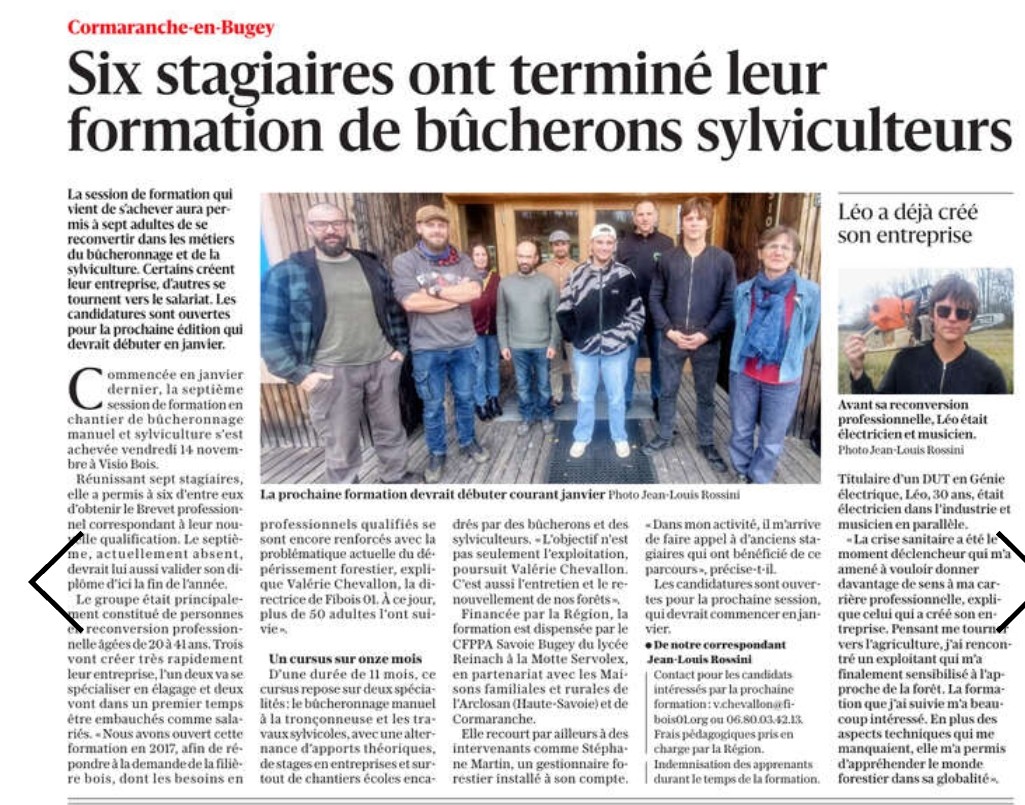 6 adultes viennent de finaliser leur Brevet Professionnel Responsable de Chantier de Bûcheronnage Manuel et Sylviculture dispensé dans l'Ain, dans les locaux de Fibois 01. 3 d'entre eux créeront leur entreprise d'ici fin 2025, les 3 autres s'orientant vers le salariat. Un 7ème candidat, actuellement blessé, terminera sa formation dans les semaines à venir. La formation 2026 débutera mi-janvier et le recrutement est d'ores et déjà en cours !