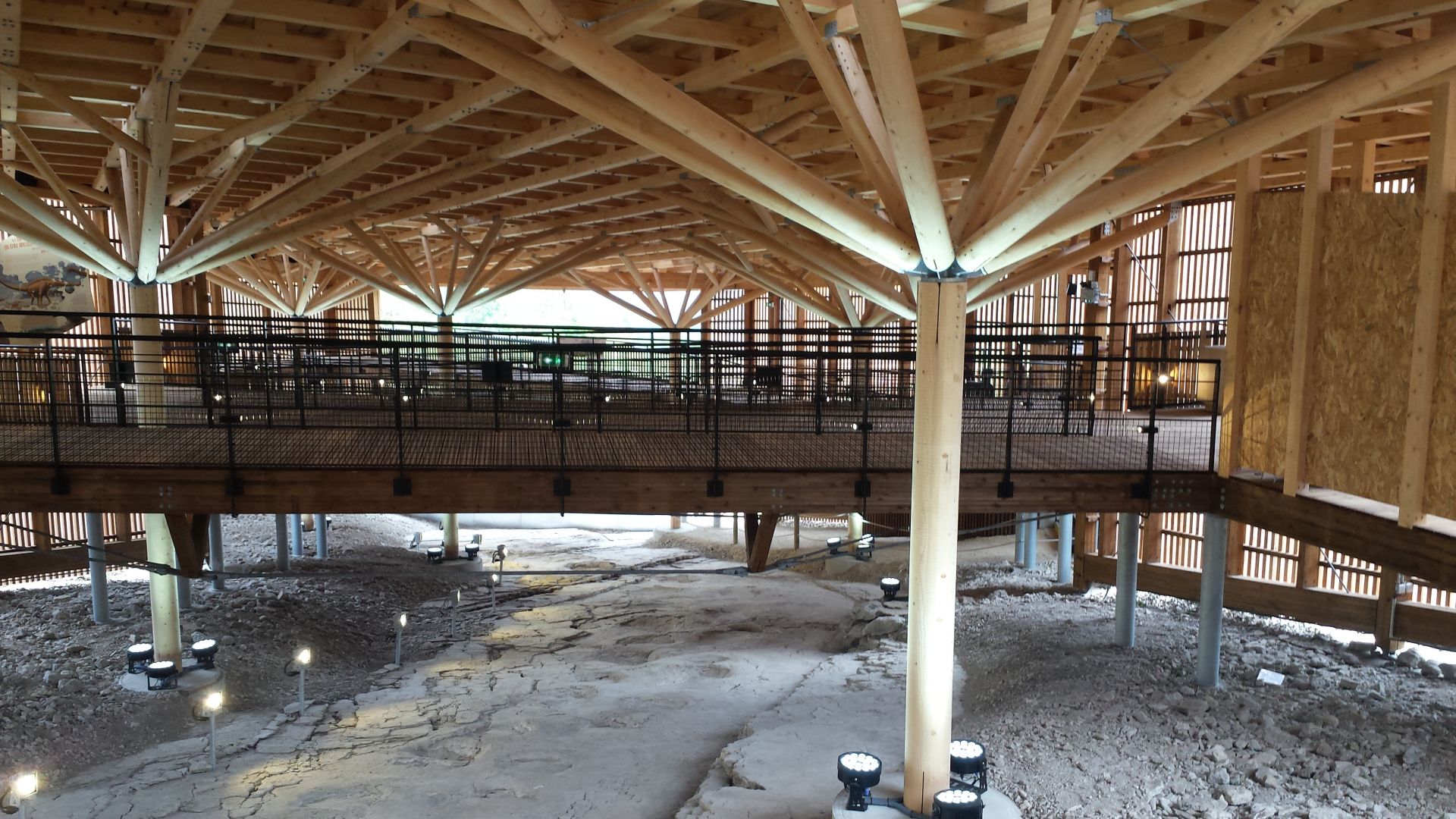 A DINOplagne, le bâtiment Canopée qui protège les traces de dinosaures et le bâtiment d'accueil du public ont été construits avec du bois issu de la forêt située autour du site, par des entreprises locales.