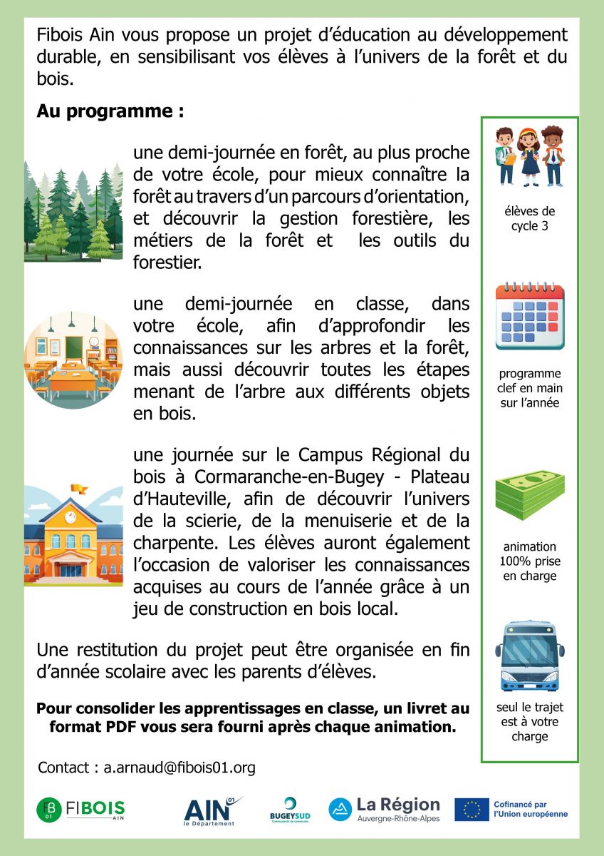 Fibois Ain vous propose un projet d’éducation au développement durable, en sensibilisant vos élèves de Cycle 3 à l’univers de la forêt et du bois.